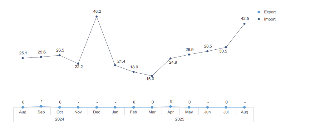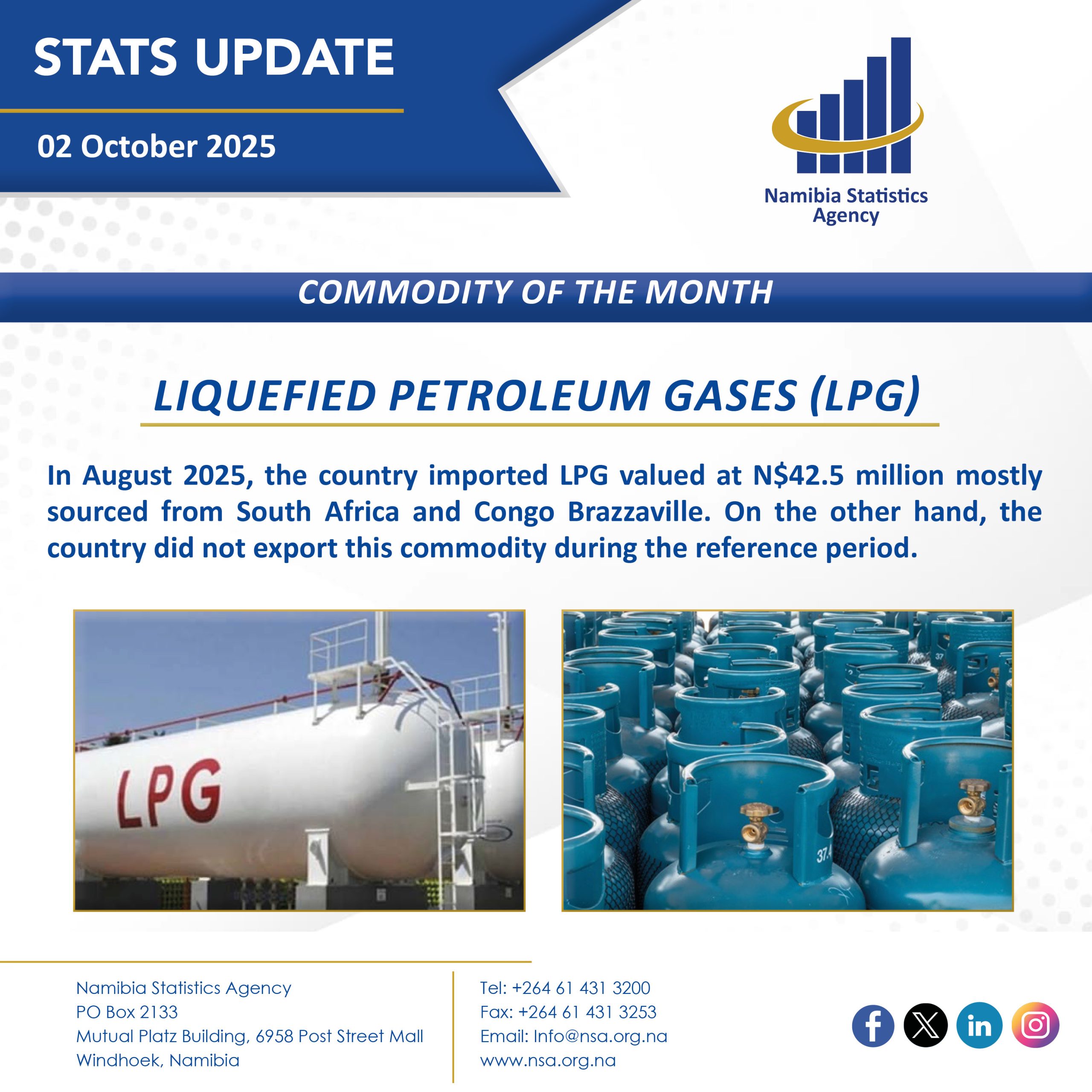 In August 2025, the country imported LPG valued at N$42.5 million mostly sourced from South Africa and Congo Brazzaville. On the other hand, the country did not export this commodity during the reference period.
